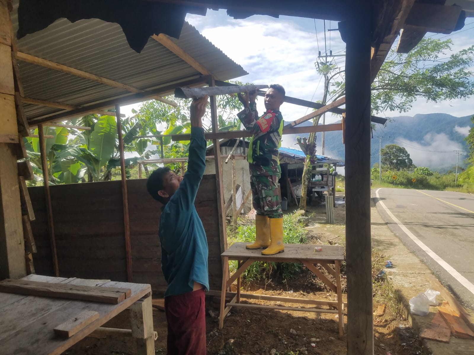Dalam rangka mewujudkan kemanunggalan TNI bersama rakyat, Babinsa Posramil Beutong Ateuh Banggalang Kodim 0116/Nara Sertu Gunawan bersama warga bergotong-royong membantu masyarakat untuk membuat kedai milik bapak Ramli di Desa Blang Puuk kecamatan Beutong Ateuh Banggalang Kabupaten Nagan Raya, Sabtu (22/02/2025).